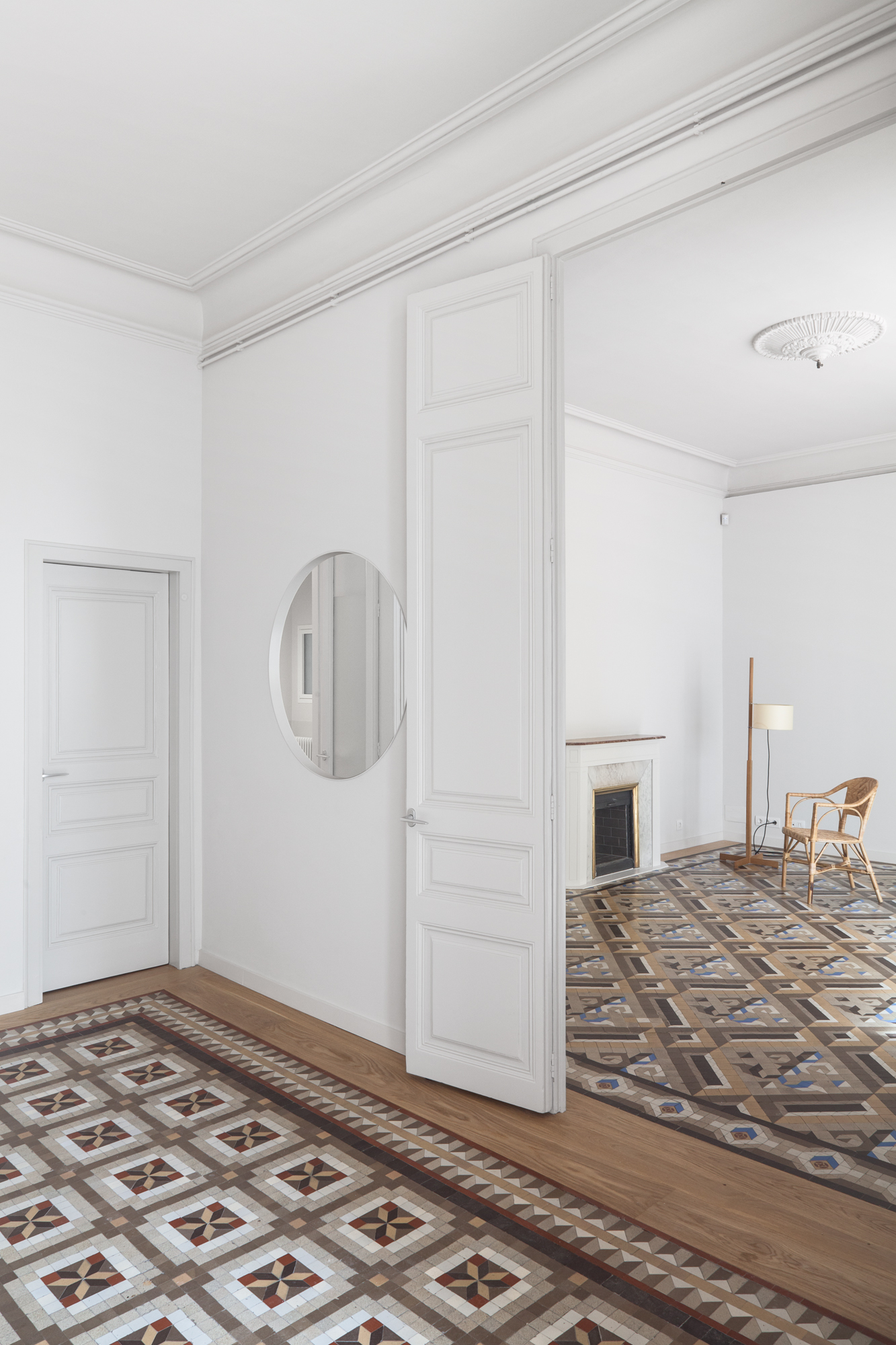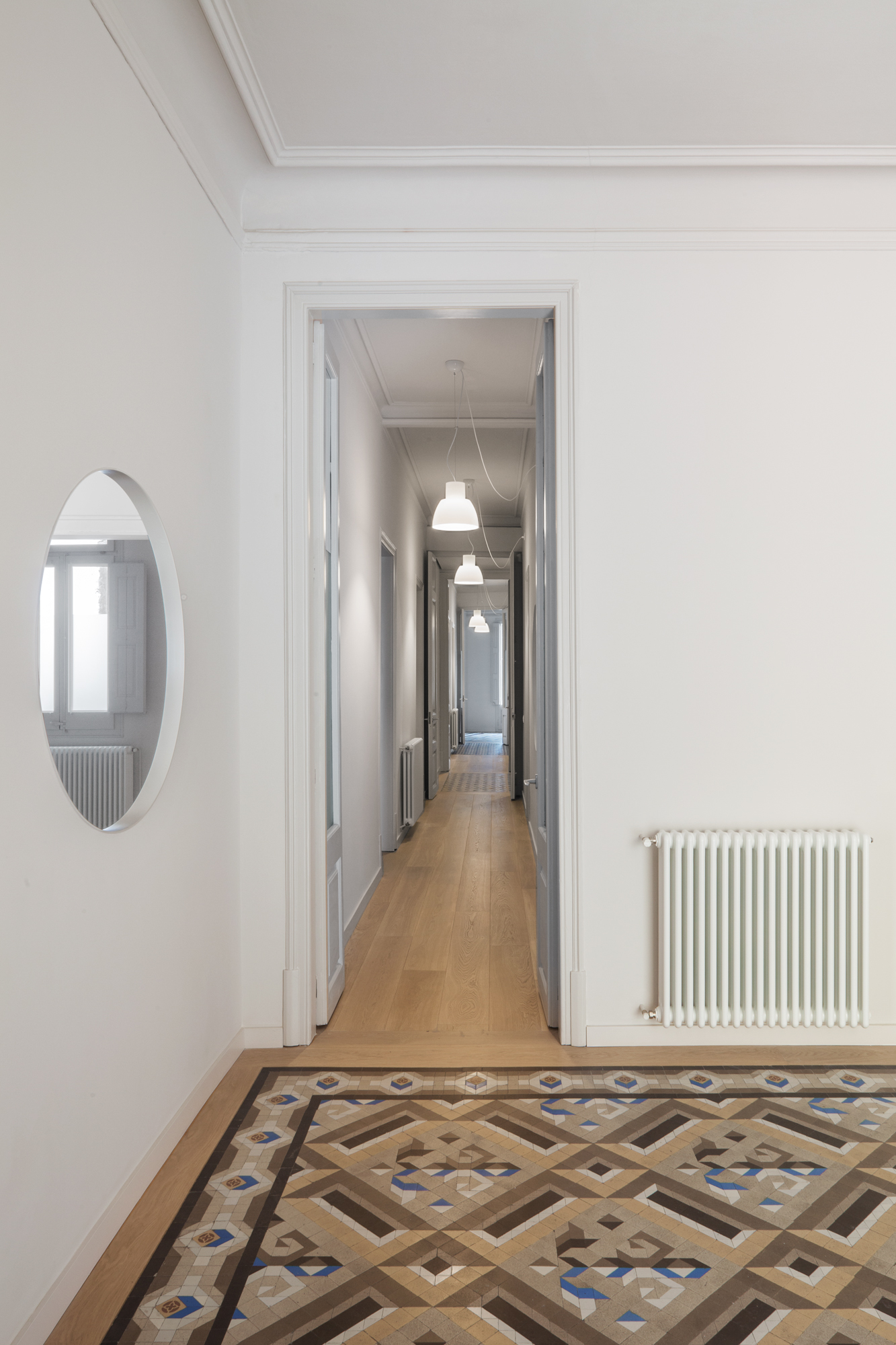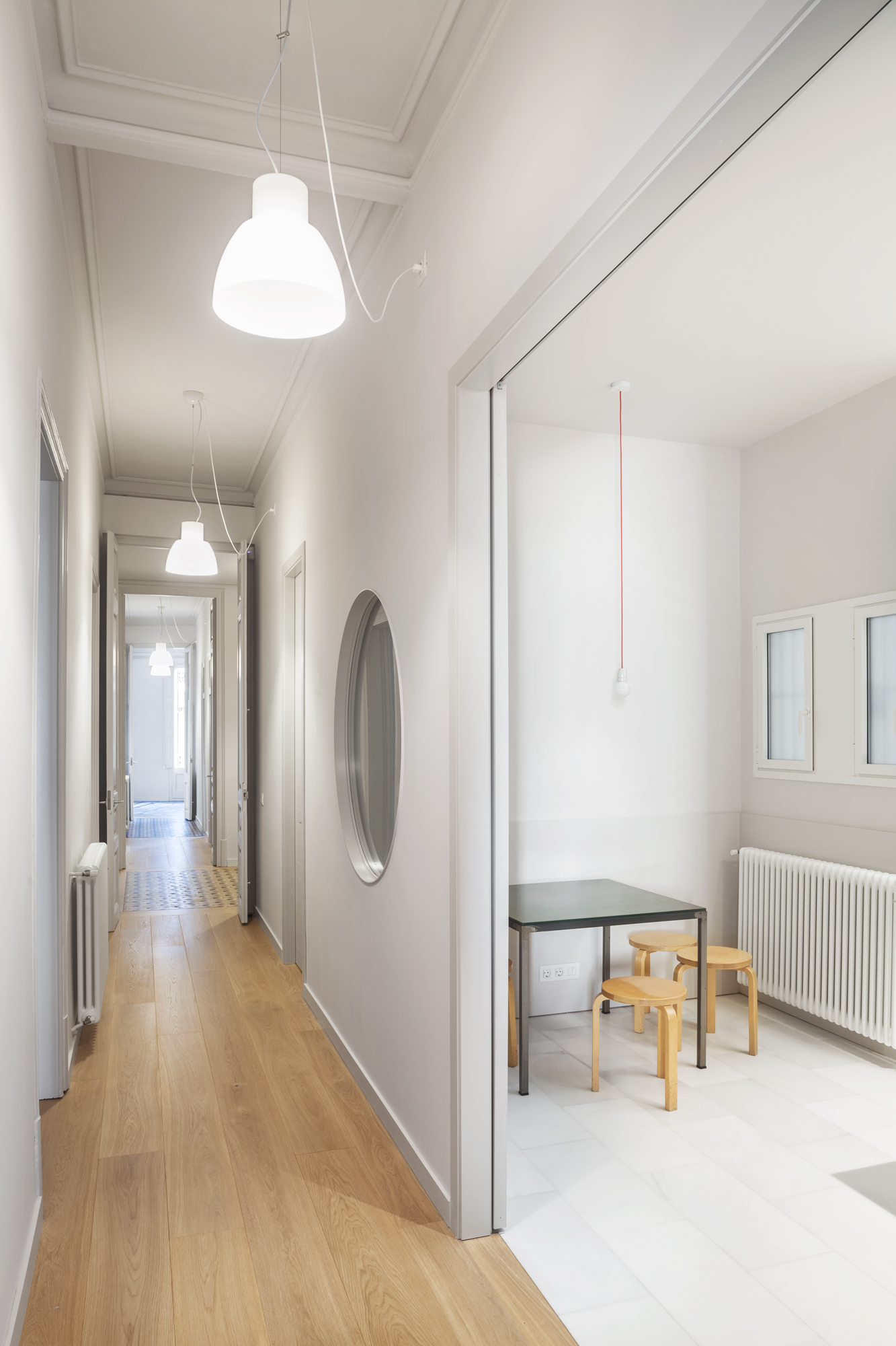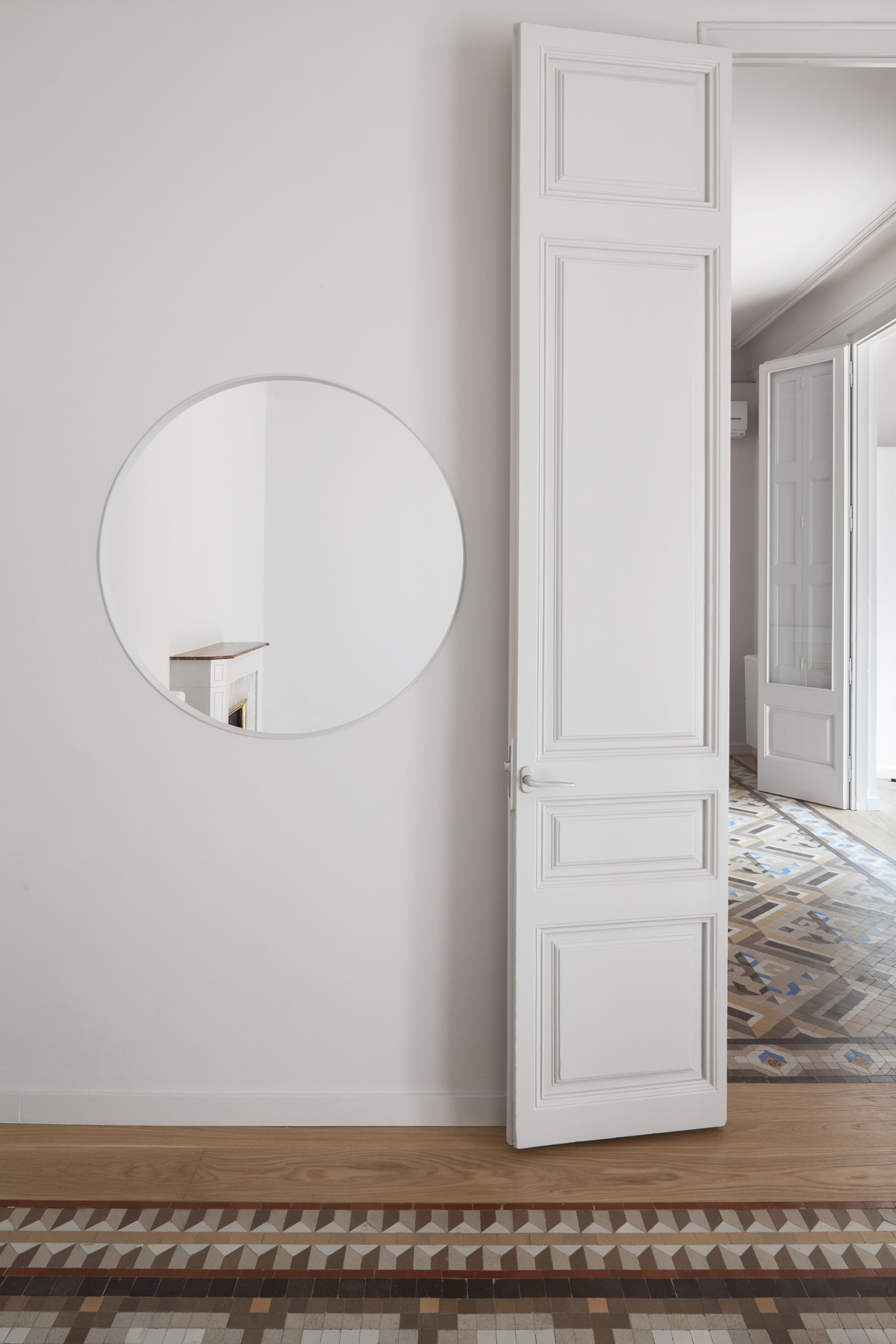 Las baldosas de mosaico Nolla del siglo XIX restauradas, que adquieren el carácter de alfombras una vez enmarcadas por cantos de roble, y el color uniforme de paredes, techos y carpintería son los protagonistas de nuestro esquema. Dos óculos circulares, en el salón y la cocina, dan testimonio adicional de la nueva intervención.