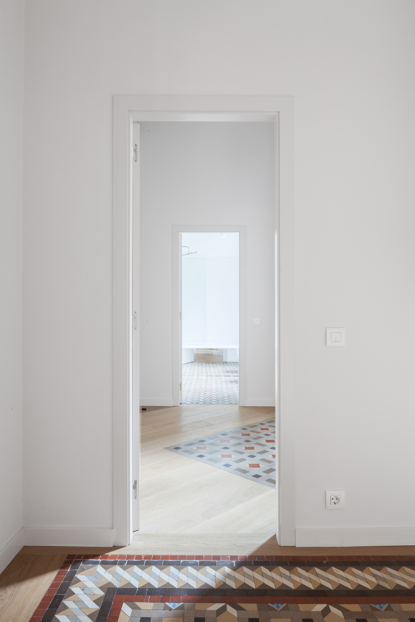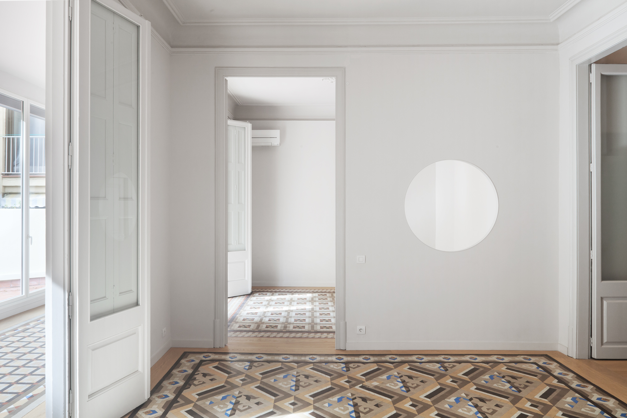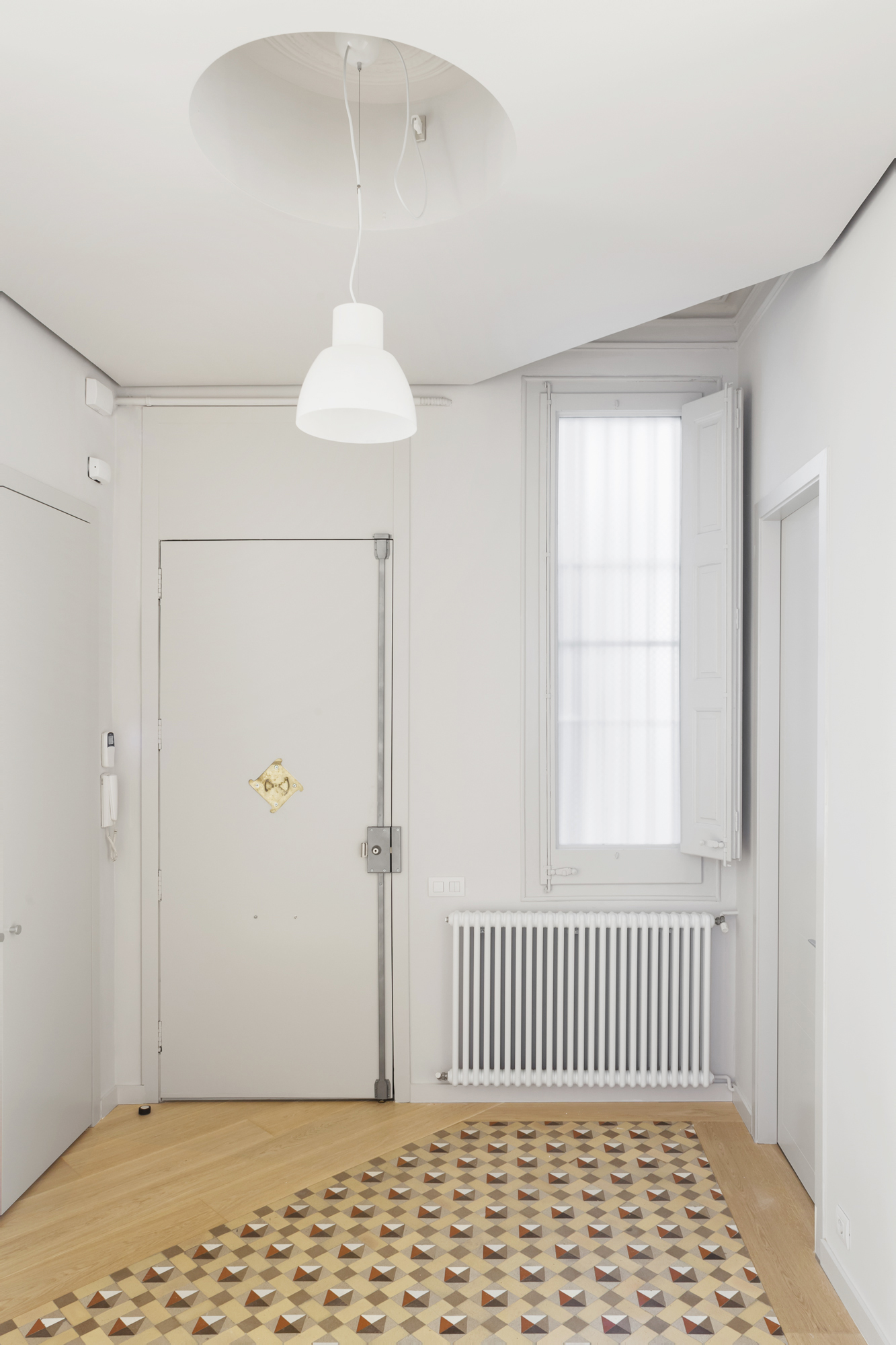 Las baldosas de mosaico Nolla del siglo XIX restauradas, que adquieren el carácter de alfombras una vez enmarcadas por cantos de roble, y el color uniforme de paredes, techos y carpintería son los protagonistas de nuestro esquema. Dos óculos circulares, en el salón y la cocina, dan testimonio adicional de la nueva intervención.