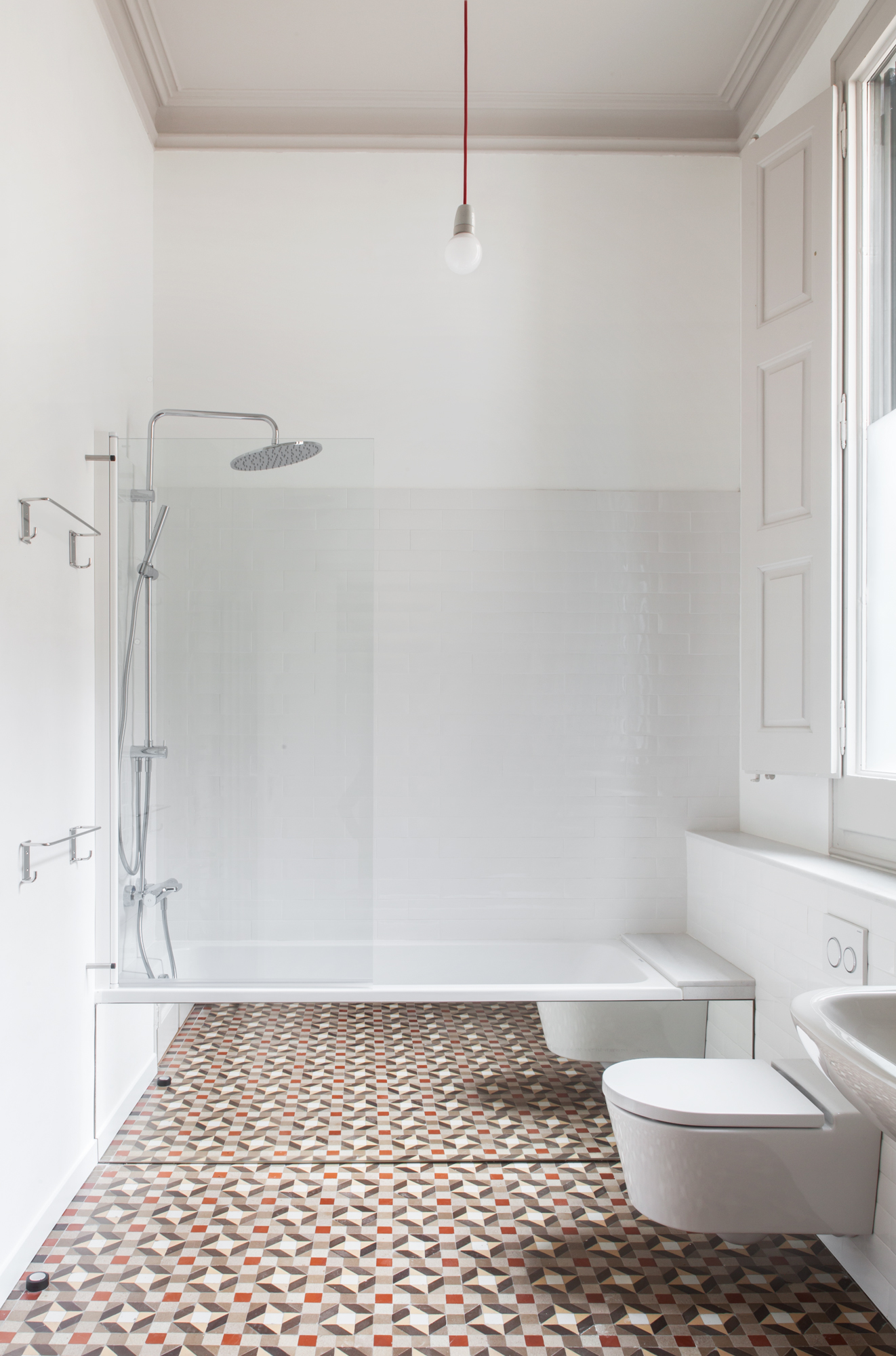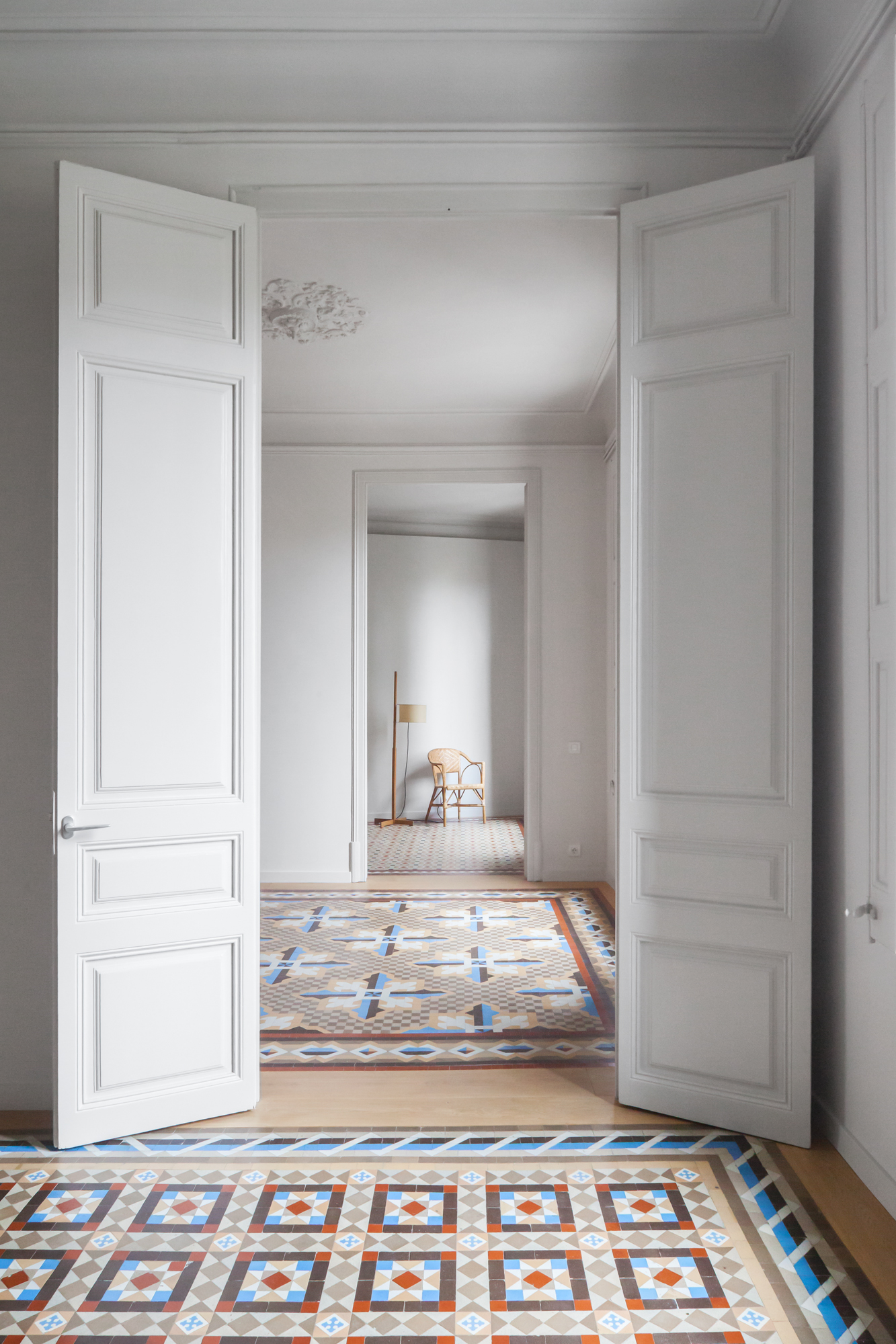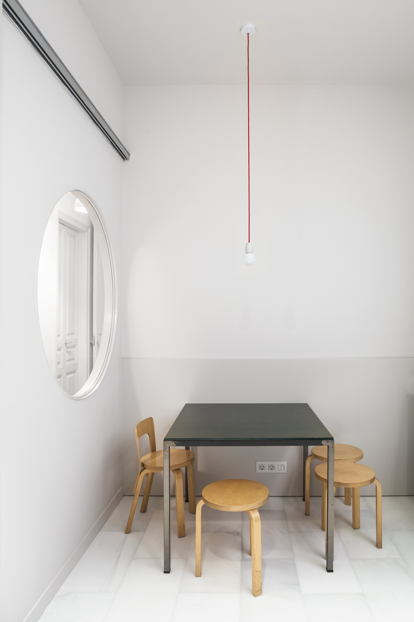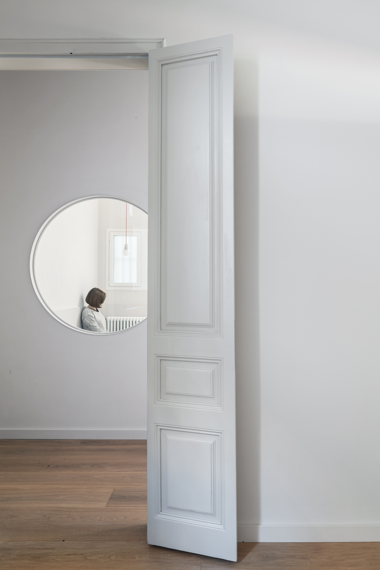 Las baldosas de mosaico Nolla del siglo XIX restauradas, que adquieren el carácter de alfombras una vez enmarcadas por cantos de roble, y el color uniforme de paredes, techos y carpintería son los protagonistas de nuestro esquema. Dos óculos circulares, en el salón y la cocina, dan testimonio adicional de la nueva intervención.