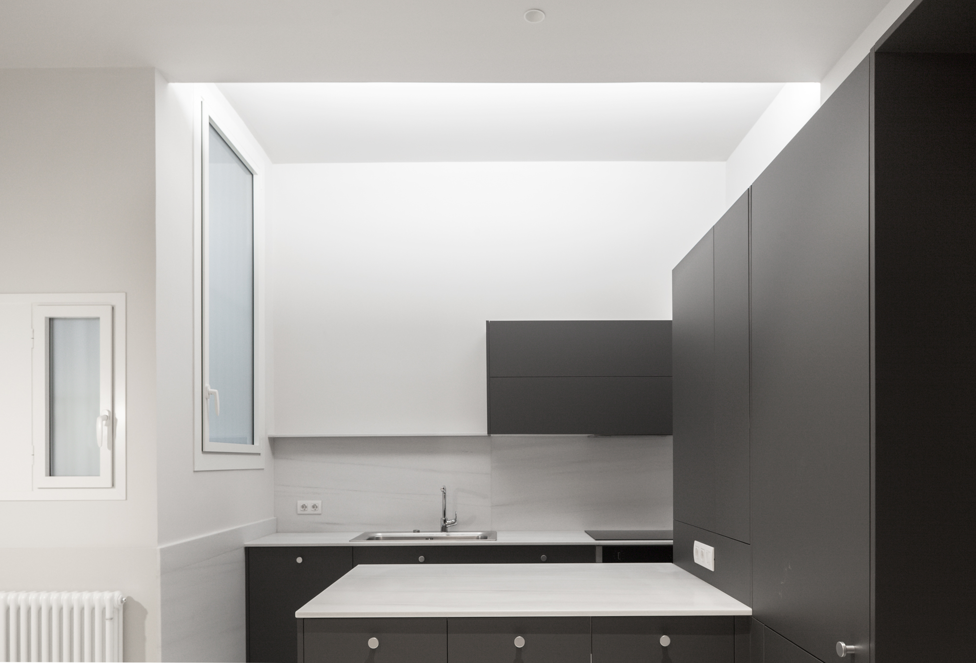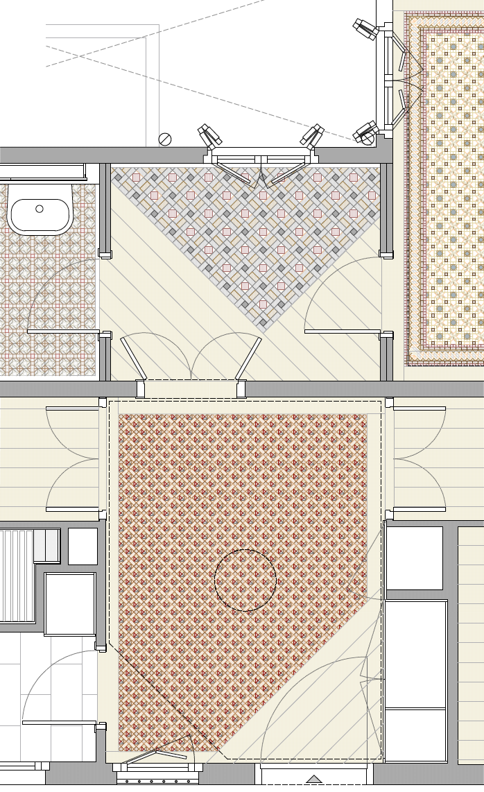 The restored 19th century Nolla mosaic floor tiles, which acquire the character of carpets once they are framed by oak edges, and the uniform colour of walls, ceilings and woodwork are the protagonists of our scheme. Two circular oculi, in the living room and kitchen, provide additional evidence of the new work.