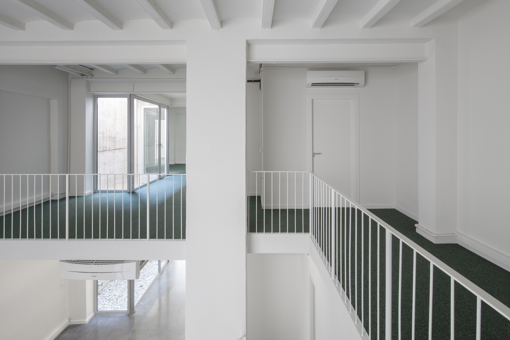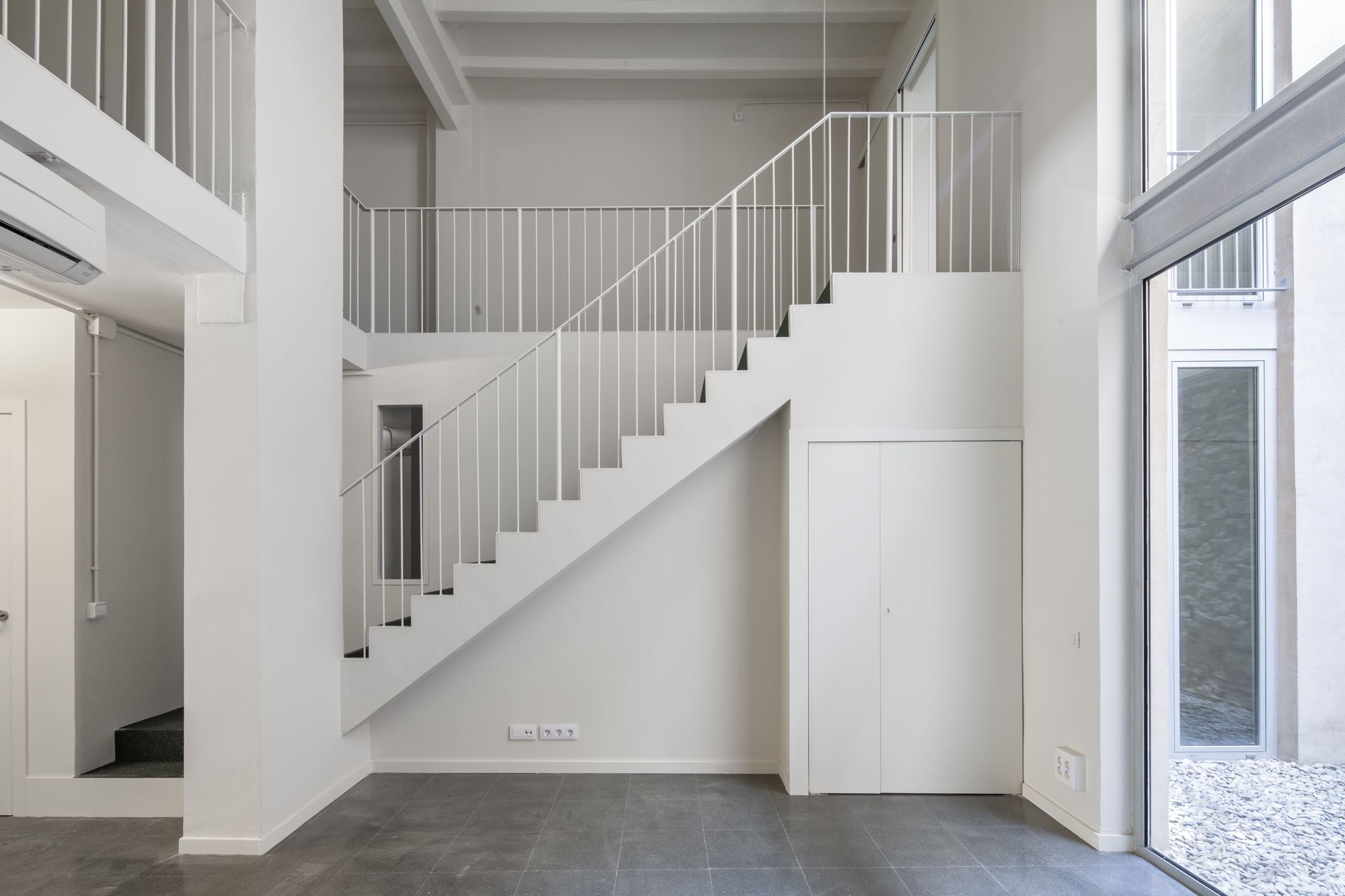 Our original renovation of the building, almost twenty years ago, consisted of modifications to two flats: the restoration of carpentry and modernisation of kitchens, bathrooms and services. Decorative facade esgrafiados were brought back to life. The double-height entry vestibule, hidden for years by a makeshift shoe repair shop, revealed a floral-motif ceiling fresco later enhanced with an oversized mirror. Finally, a two-storey commercial space devoid of daylight was fitted with new light wells and stairs.