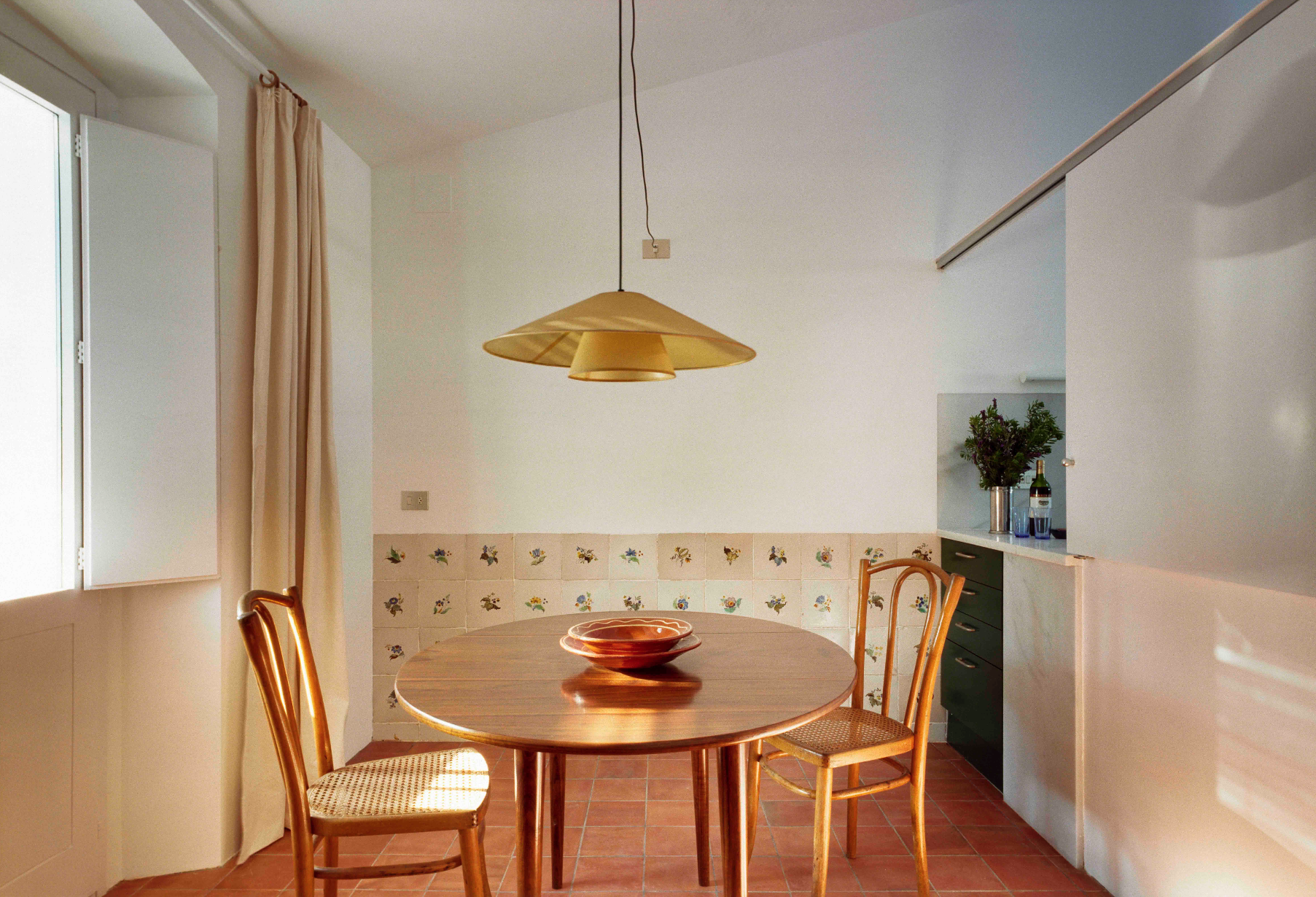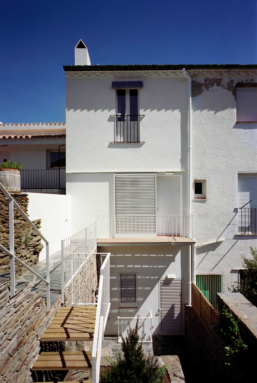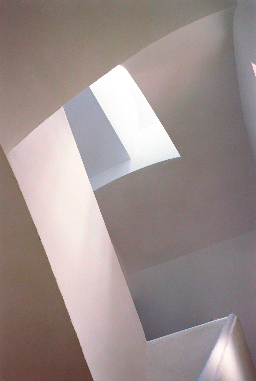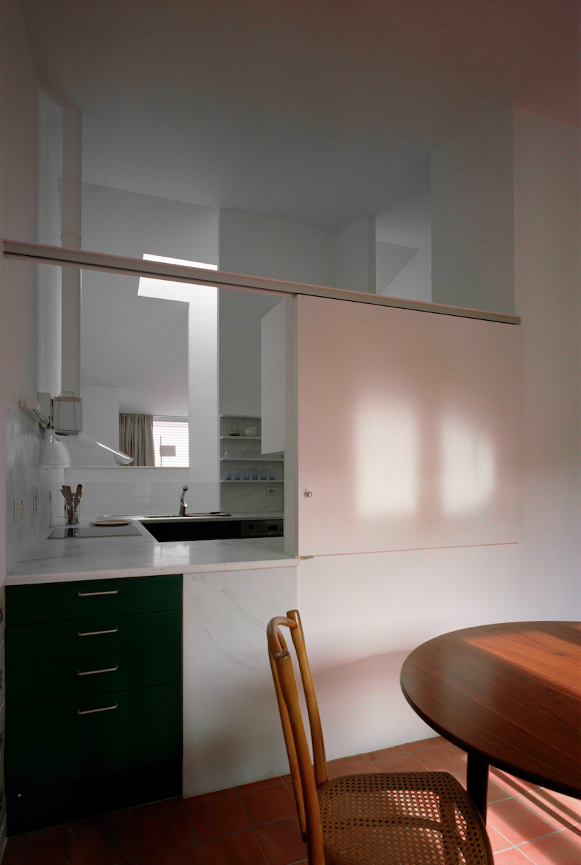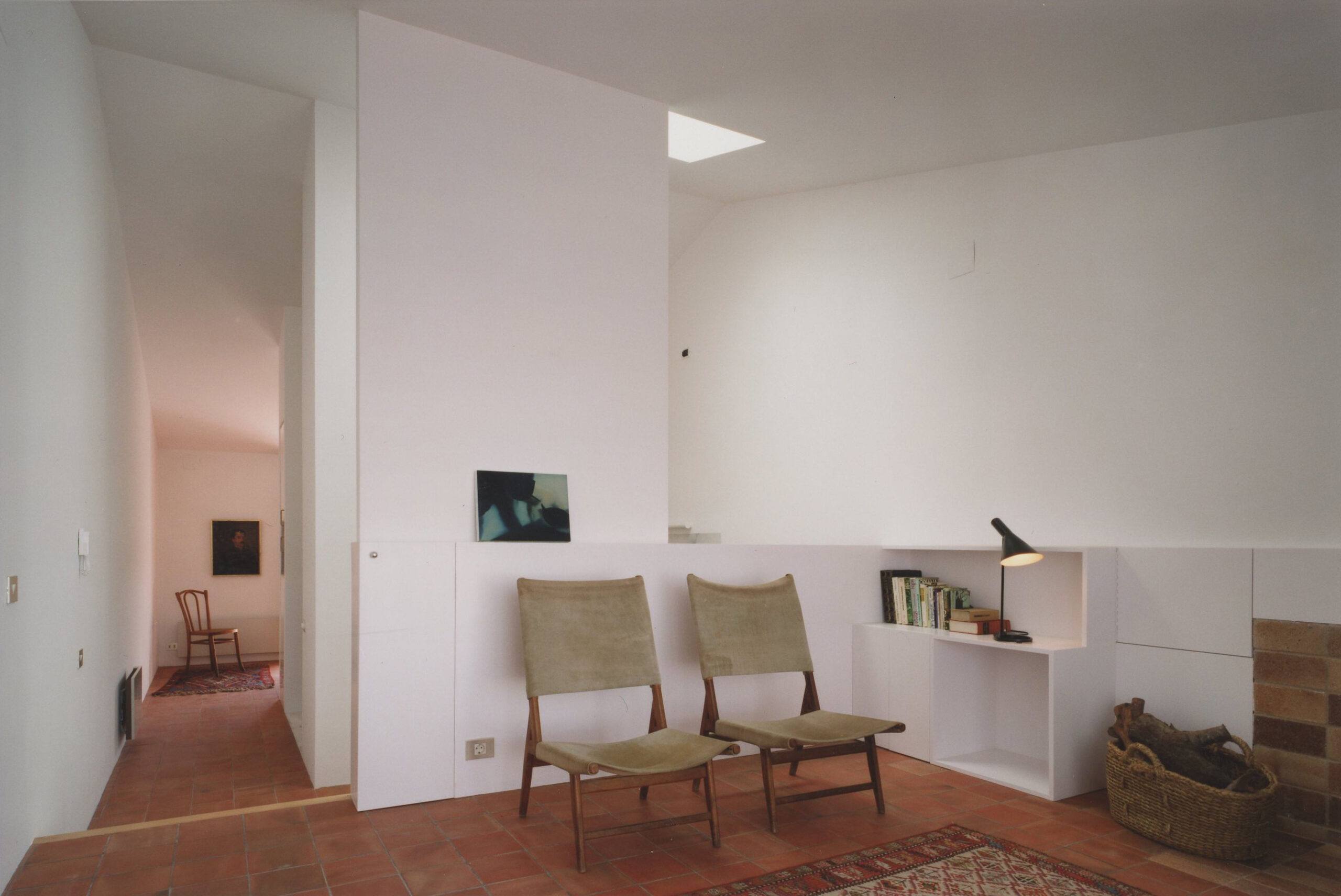 In our remodelling scheme particular emphasis was placed on the upper floor, the most luminous level of the house and expansive views, to the east overlooking the bay, and to the west across a landscape of hills and Mount Pení. A new insulated roof was built reusing the old terracotta tiles. The former terrace lookout was removed and a sequence of interrelated living spaces -sitting room, kitchen and dining room- were created around the existing stairwell for which a new skylight was made.