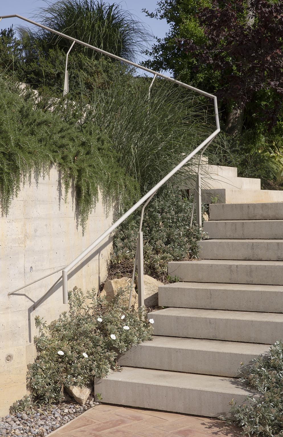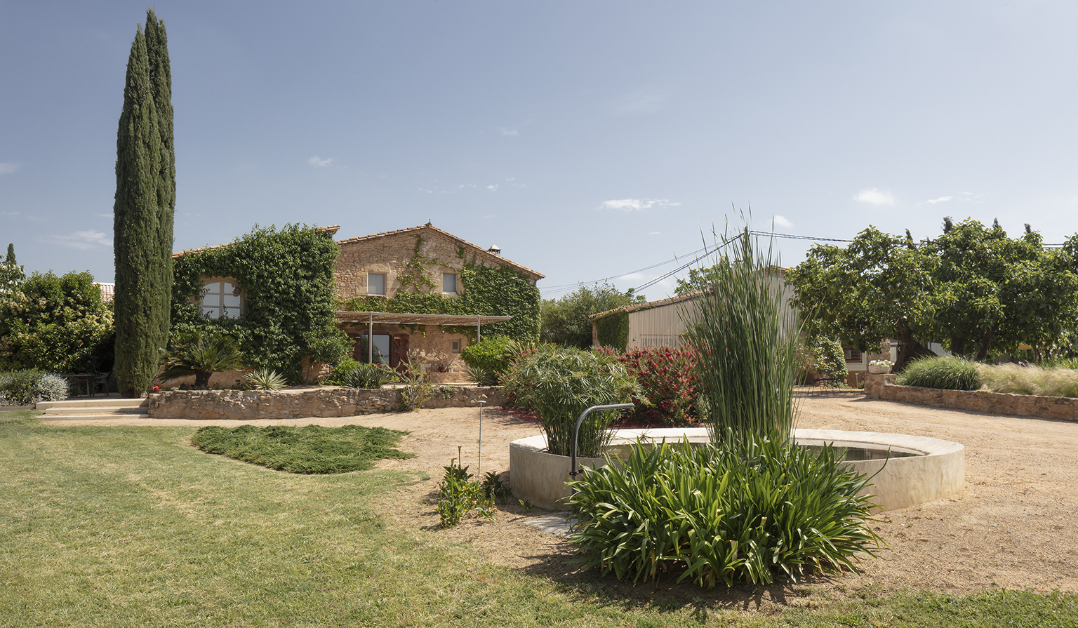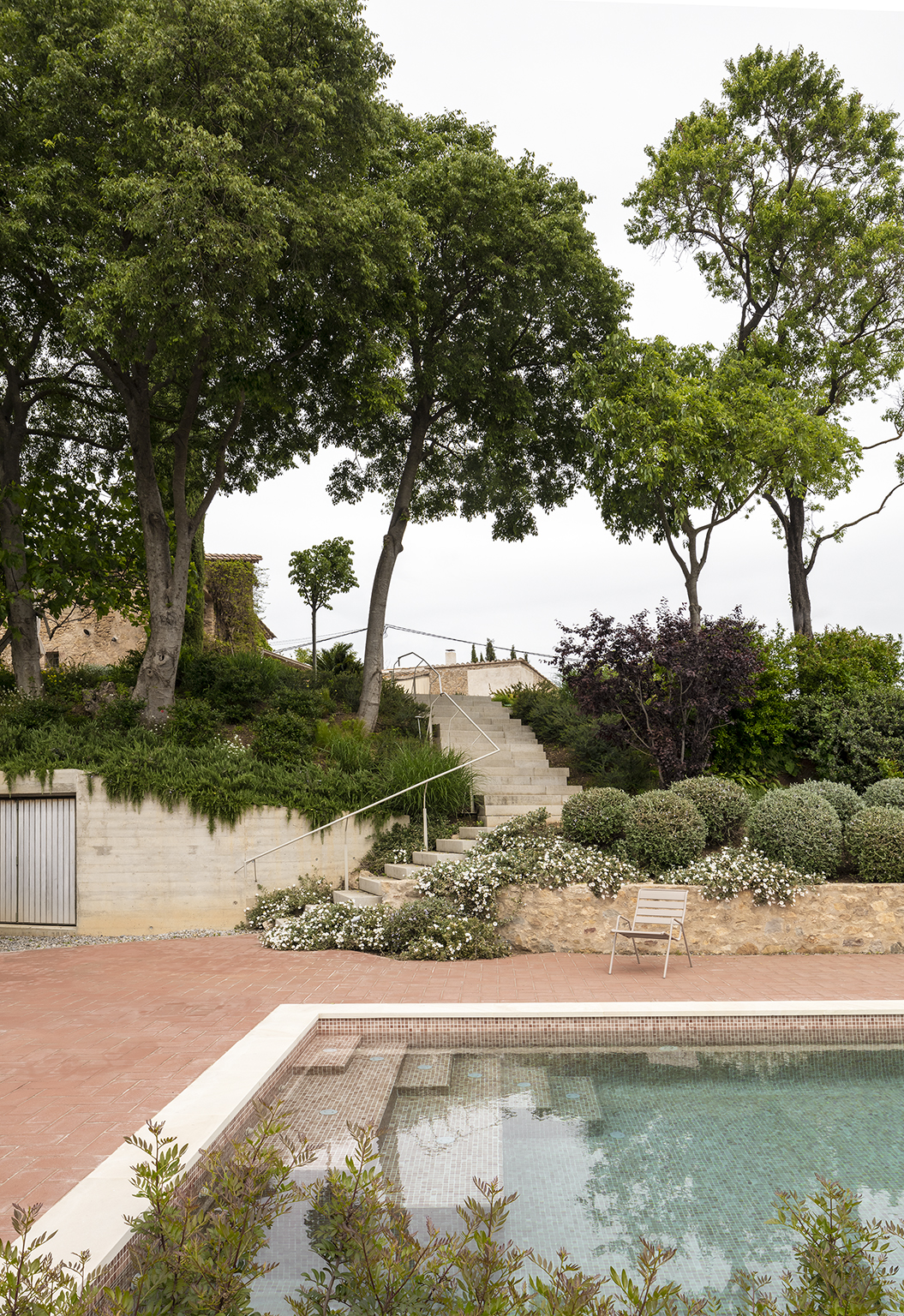 After surveying the buildings and creating an inventory of existing trees and shrubs, our first task was the erasure of years of problematic interventions by former owners, for whom the mas was no longer a working farm, entailing the removal and substitution of deteriorated structural elements and poorly built additions. A delicate new pergola set against the masia’s main facade and a well-water cistern in the form of a raised reflecting pond are two elements in a sequence including stairs, pool, planted parterres and berms, fields and orchards.