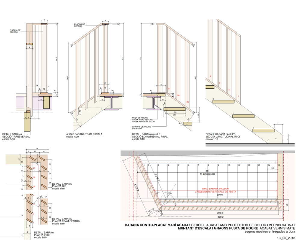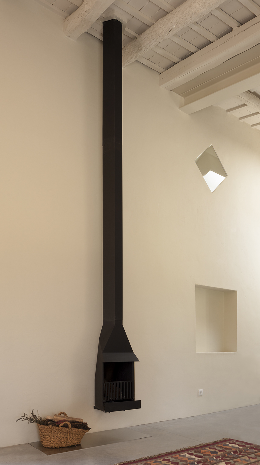 La masía, fiel a su tipo, un edificio de dos plantas de piedra con tejado de terracota, está dividida en tres crujías con una pequeña ala en planta baja construida posteriormente. En el gran vestíbulo de entrada se aprecian los elementos principales de nuestra reforma: el nuevo forjado del primer piso de tableros contrachapados pintados sobre vigas de madera laminada y viguetas de acero y una nueva escalera de roble macizo con una balaustrada de madera de abedul que culmina en una nueva claraboya. Su expresión formal, diferenciada del carácter pétreo del edificio, intenta dignificar y domesticar estos espacios centrales y representativos.