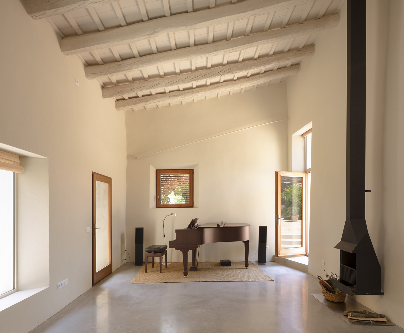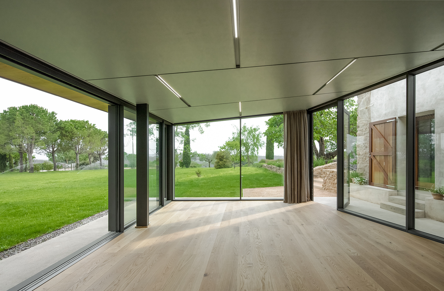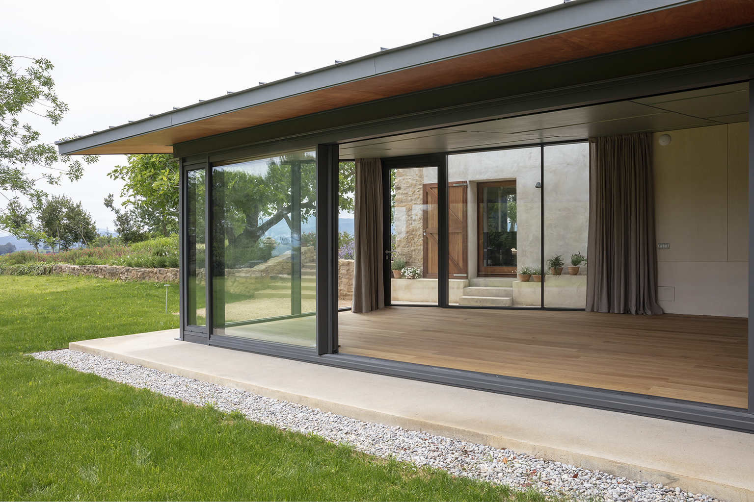 Two additional adjoining structures to the east, the former haybarn, stables and mill room were adapted as storage shed and music room. A third, a decaying single-pitched shed, was rebuilt as a pavilion for the practice of Tai Chi. In the process, historic building techniques were revealed – a La Garrotxa-style roof of solid chestnut planks, stone buttresses – which were juxtaposed against new materials and compositional expressions: an Accoya-wood facade for the shed or a glass enclosure with overhanging zinc-clad roof for the pavilion.