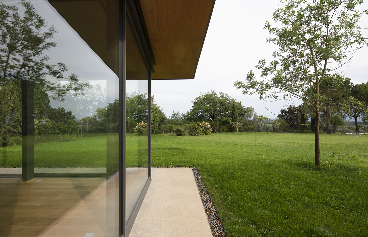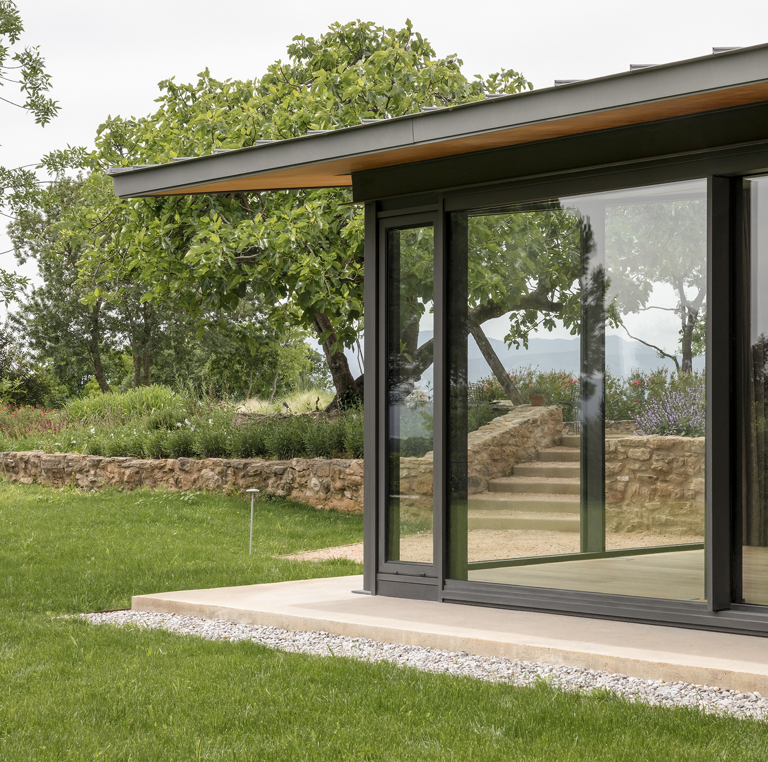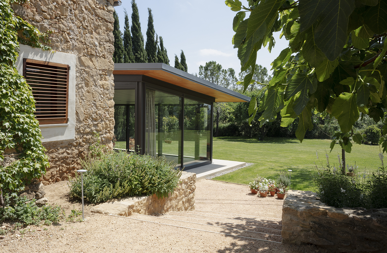 Una nueva y delicada pérgola adosada a la fachada principal de la masía y una cisterna de agua de pozo en forma de estanque elevado son dos elementos de una secuencia de intervenciones exteriores que incluye la valla de entrada, escaleras y caminos, piscina, nuevos árboles y parterres, taludes restaurados y prados re-naturalizados.