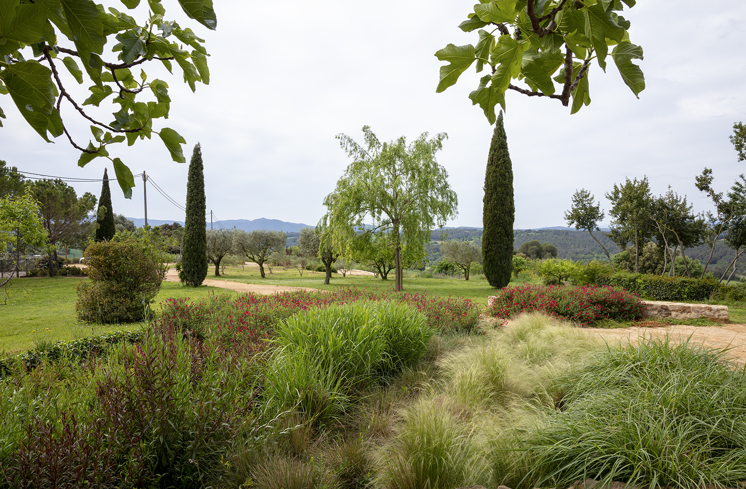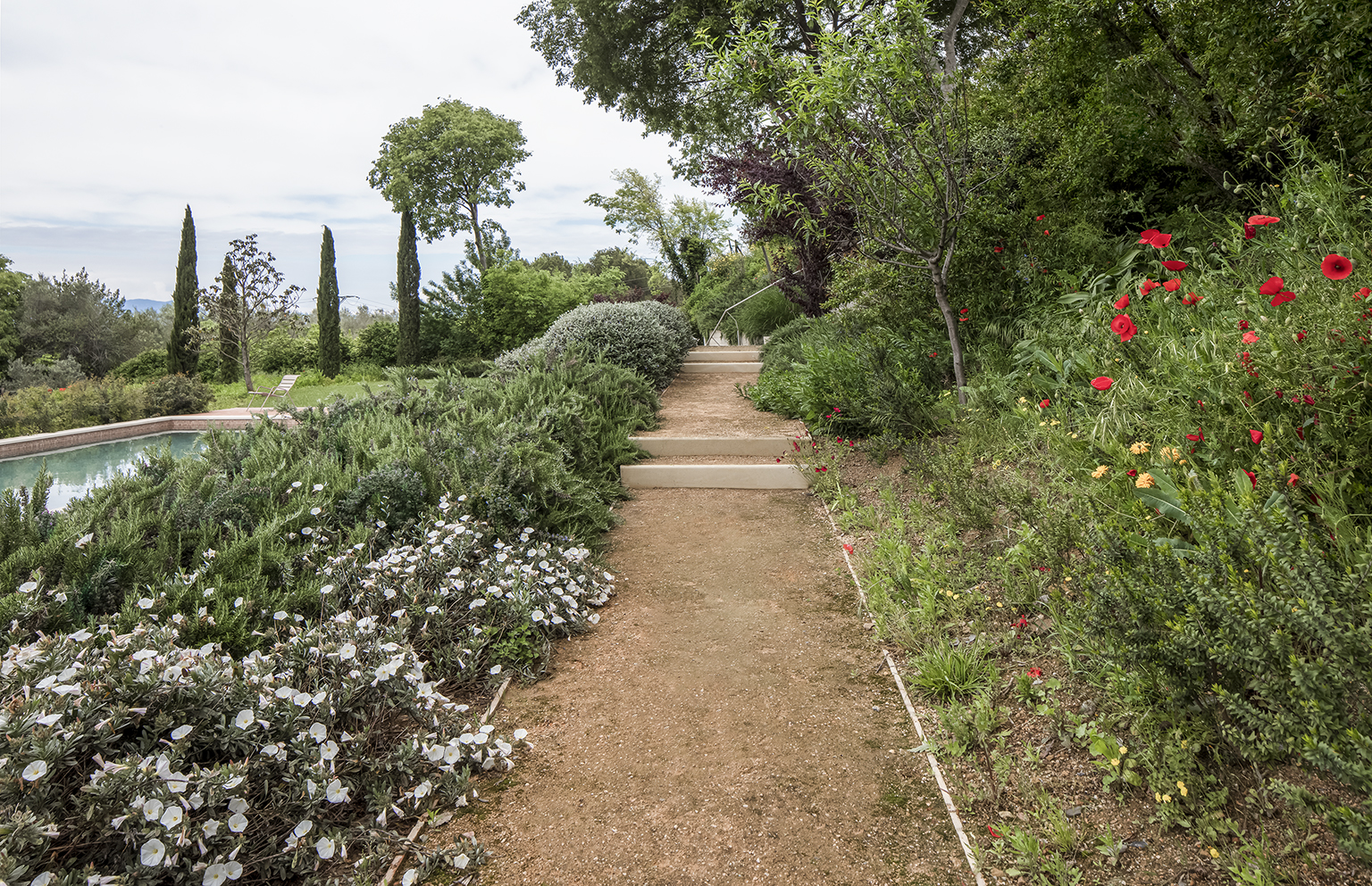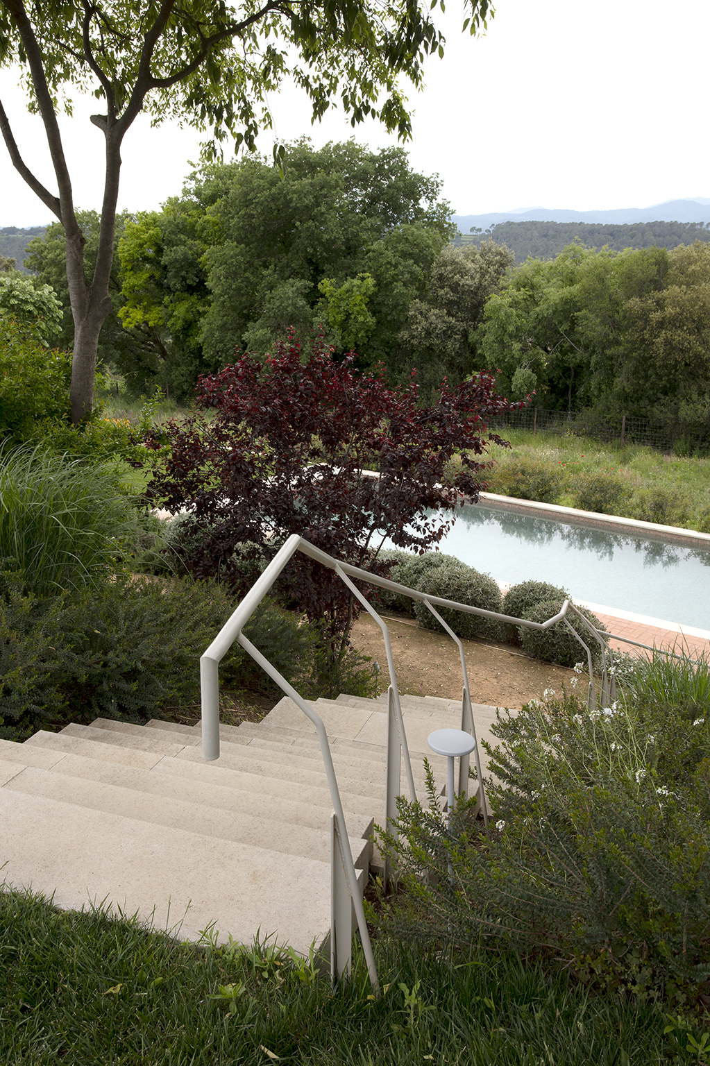 A nine-hectare 18th century agricultural property, or mas , was the raw material. Historically, most of the land had been sowed with forage for livestock. The rainfed fields along the masia’s distant southern boundary, with the foreground era (threshing ground), meadow and orchard, as well as wooded areas between the terraced fields, defined the structure upon which we introduced areas of a more domestic nature – paths, planting, future kitchen garden,mirador, reflecting pond-water cistern and pool – bearing in mind our client’s stewardship of the land, its mature trees and water management.