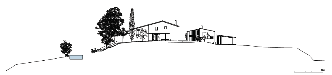 La materia prima de nuestro proyecto fue una propiedad agrícola – un mas – del siglo XVIII de nueve hectáreas, presidido por una masia. Históricamente, la mayor parte del terreno se había sembrado con forraje para el ganado. Estos campos de secano de sutiles pendientes con importantes taludes arbolados entre ellos, junto con la era de trillar, el prado y el huerto, componían la estructura sobre la que introdujimos zonas de carácter más doméstico: caminos, plantaciones, futuro huerto, mirador, estanque-aljibe y piscina. Se tuvo en cuenta el deseo de continuidad, por parte de nuestro cliente, de la administración de las tierras productivas, el cuidado de los árboles maduros y la gestión del agua.