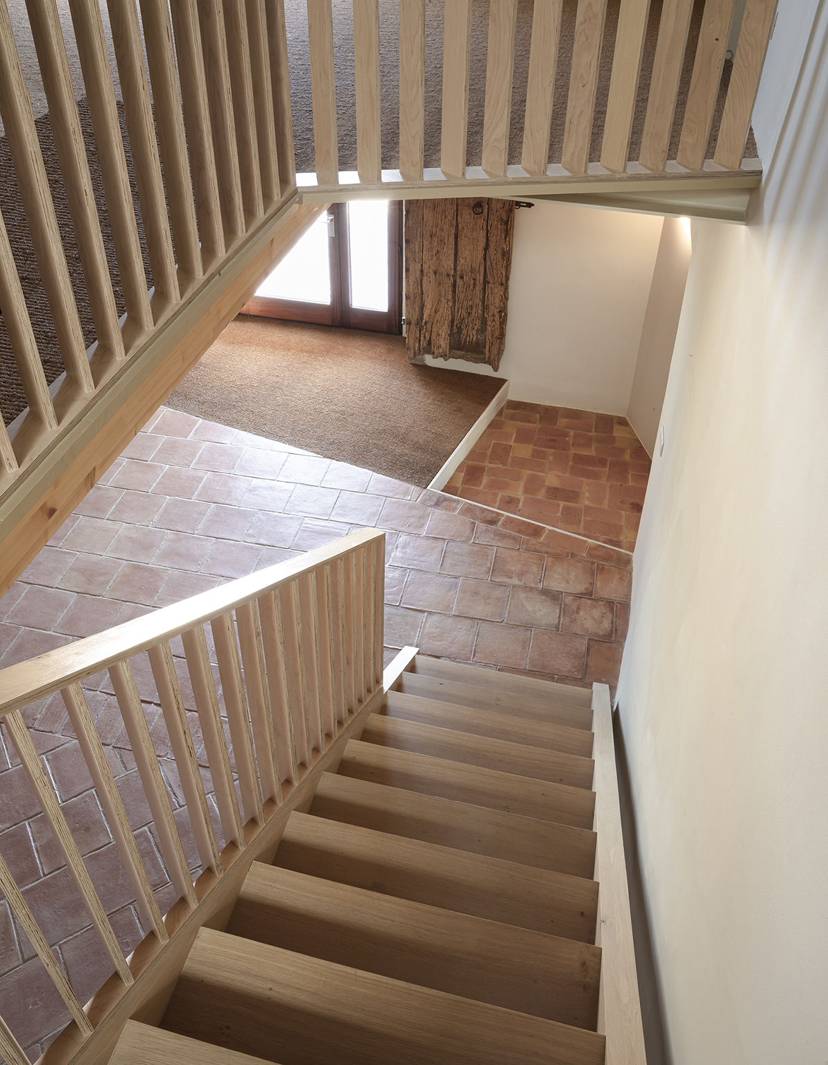 The masia, true to type, a stone building with a terracotta-tiled roof, is divided in three bays with a small corner wing built later. In the large entrance hall, the basic elements of our scheme are apparent: the new first floor structure, painted plywood on laminated timber beams and steel joists and a new solid oak stair with a birchwood balustrade culminating in a new skylight. Their formal expression, differentiated from the fabric of the building, attempts to dignify and domesticate these central, representative spaces.