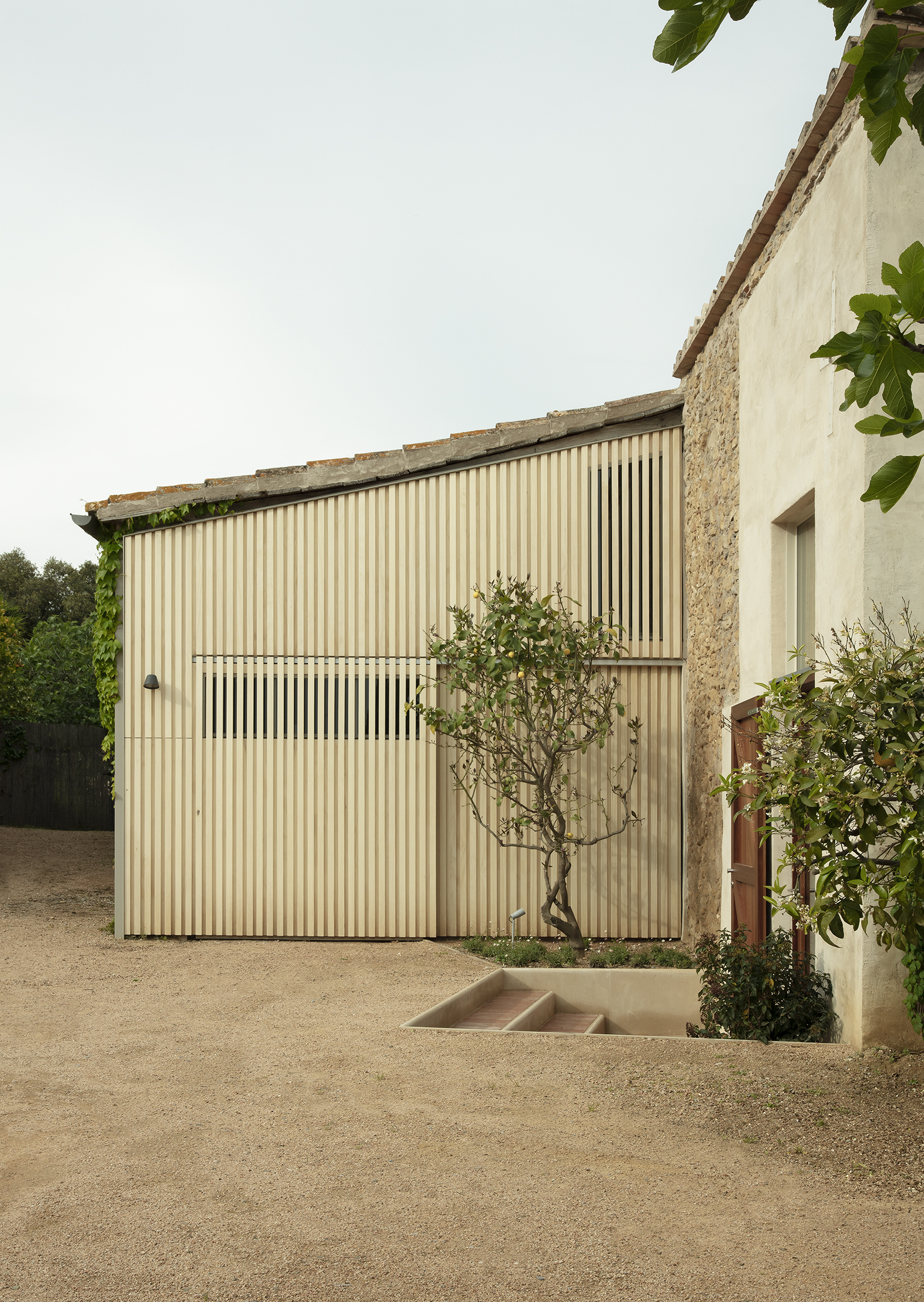 Dos estructuras contiguas a la masia, el antiguo pajar por un lado, y los antiguos establos y sala del molino por otro, se adaptaron como almacén-taller y sala de música. Una tercera, un cobertizo en decadencia, se reconstruyó como pabellón para la práctica de Tai Chi. En el proceso, se revelaron las técnicas de construcción tradicionales, un tejado de tablones de castaño macizo al estilo de la Garrotxa, o contrafuertes de piedra y tirantes, y se yuxtapusieron con nuevos materiales y expresiones compositivas: una fachada de madera de “Accoya” para el cobertizo o un cerramiento de vidrio con tejado en voladizo revestido de zinc para el pabellón.