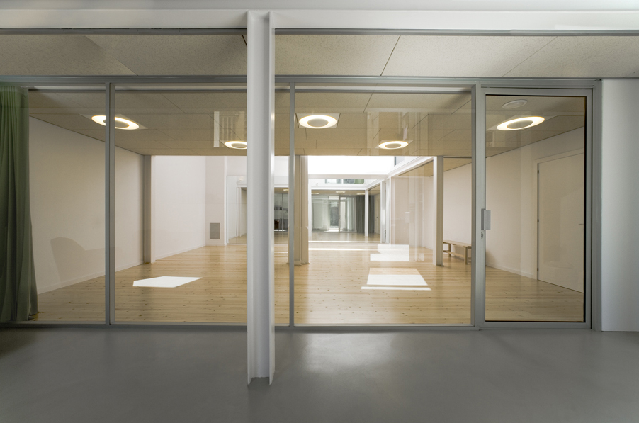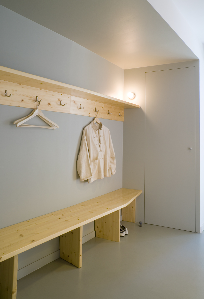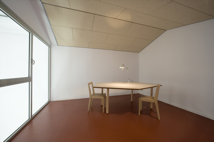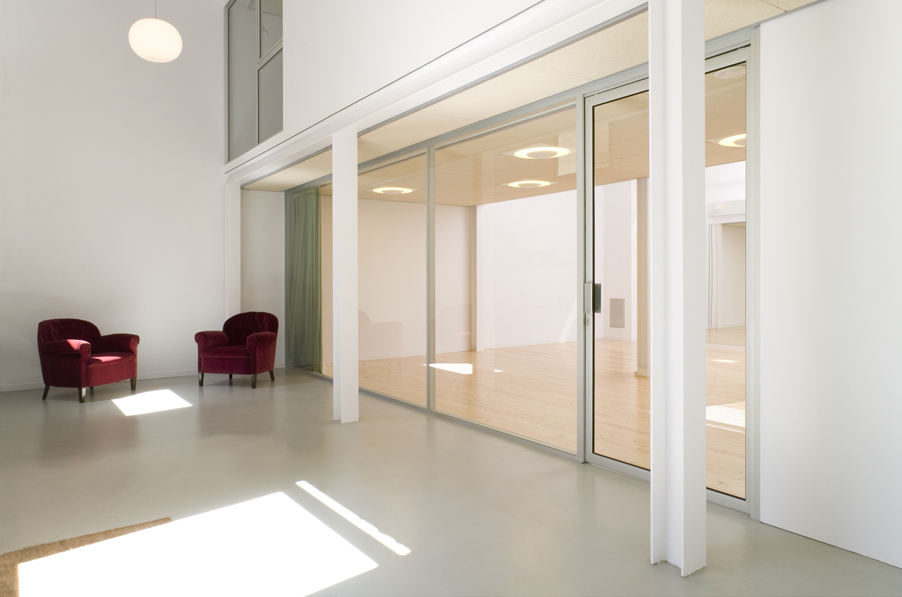 The few materials used have been chosen with a great deal of care. At the entrance level we find a continuous micro-cement paving in the transit areas and pine wood boards in the large hall. Starting at the staircase and covering the entire mezzanine floor, the linoleum paving in a saturated colour leads us through the rooms on this level. Both in the large ground floor hall and in the two smaller rooms on the upper level, the ceiling has been finished in “heraklith” in order to provide greater acoustic and ambient comfort.