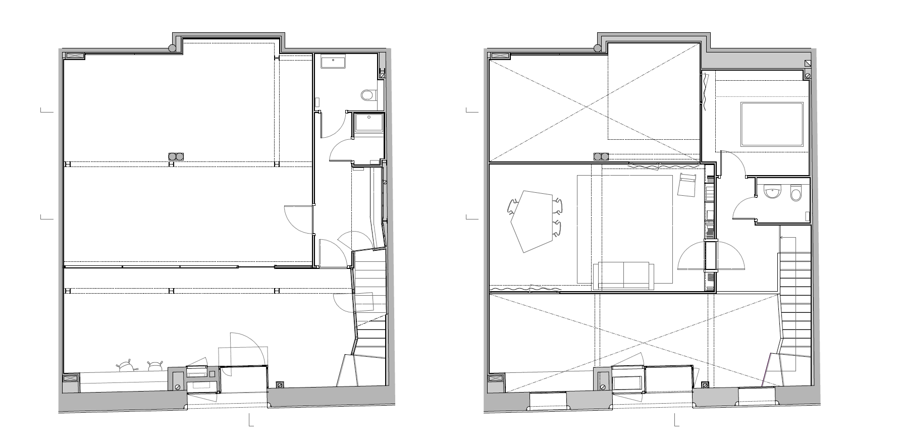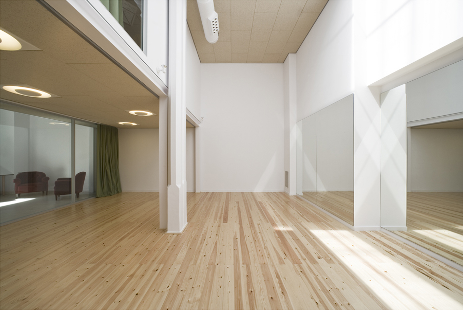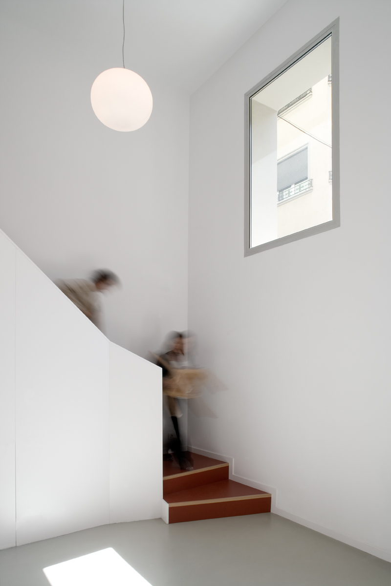 The incorporation of a new-build mezzanine meets the needs of the programme, which required a larger surface: rooms with flexible size and use and varying qualities for either dance or music, together with ancillary spaces. The mezzanine was placed in such a way that the premises would read as a whole and so that natural light would flow from one side of it to the other.